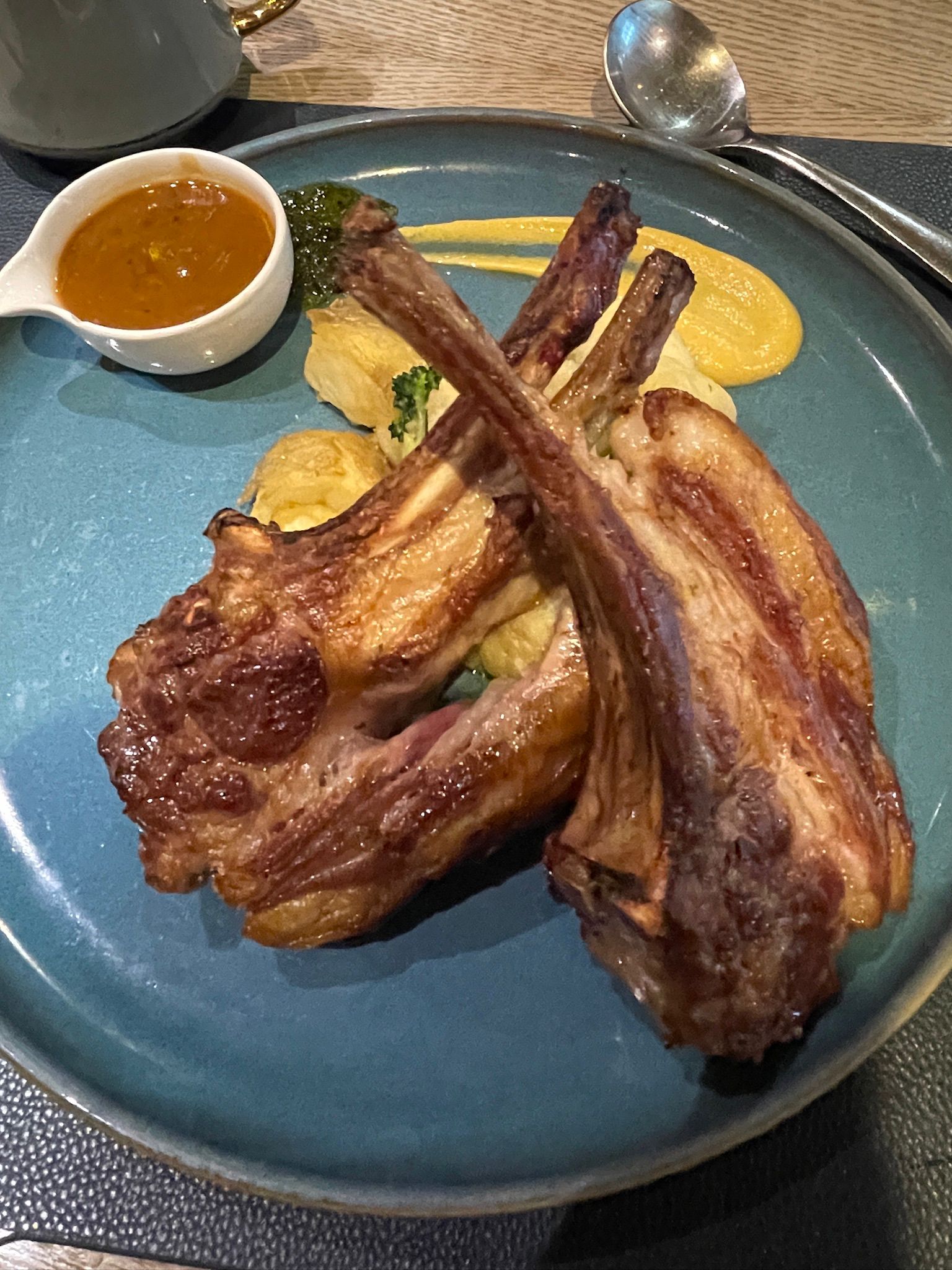 這道精緻的烤羊排料理,呈現出令人垂涎的視覺饗宴。兩塊烤至完美的羊排,骨肉分離,肉質鮮嫩多汁,外皮酥脆金黃,散發著誘人的香氣。羊排以交叉的方式擺放在精美的藍色餐盤上,更顯其獨特與優雅。 除了主角羊排,盤中還搭配了烤馬鈴薯塊,外酥內軟,口感豐富。一抹鮮亮的黃色醬汁,以及一小撮綠色蔬菜,為整道料理增添了色彩與層次感。此外,還附有一小盅特製醬汁,色澤濃郁,香氣撲鼻,相信能為羊排帶來更豐富的味覺體驗。 這道烤羊排料理,無論是擺盤、食材的選用,還是烹調方式,都展現了廚師的用心與精湛的技藝。適合追求高品質生活、注重美食體驗的您,無論是獨自享用,還是與親朋好友一同分享,都能帶來美好的用餐體驗。 主要特色: * 精選優質羊排,肉質鮮嫩多汁 * 烤至金黃酥脆,香氣誘人 * 搭配烤馬鈴薯塊,口感豐富 * 特製醬汁,提升味覺層次 * 精美擺盤,視覺享受 * 適合各種場合,無論是獨自享用還是與親友分享