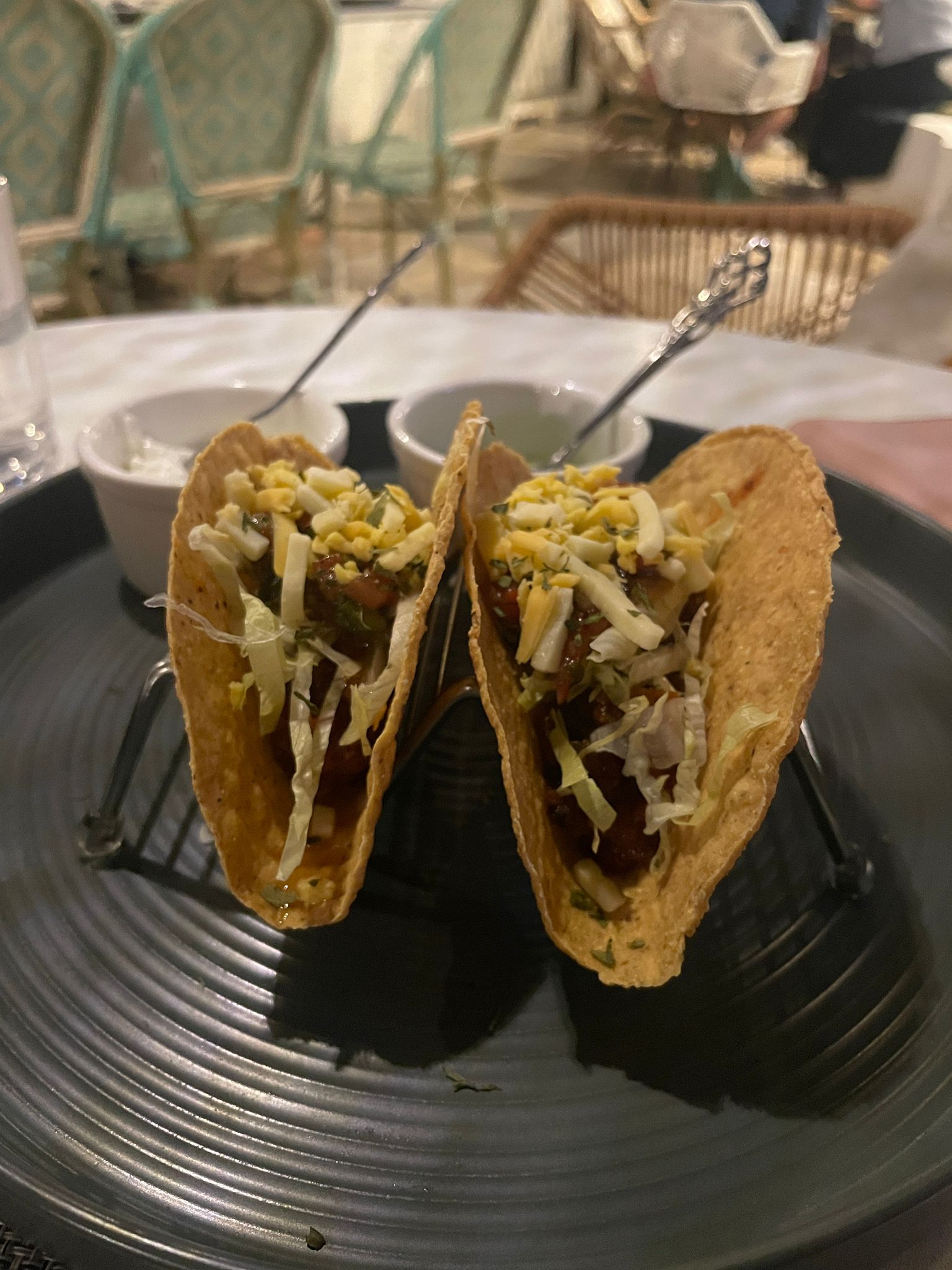 這是一道令人垂涎欲滴的酥脆玉米餅,充滿著濃郁的墨西哥風味。從圖片中可見,這道菜品由兩個金黃酥脆的玉米餅組成,它們被巧妙地放置在一個現代感的黑色盤子上,並由金屬支架固定,方便食用和展示。 玉米餅內餡豐富,包括鮮嫩的肉類、爽口的生菜和色彩繽紛的碎奶酪,每一口都能感受到食材的新鮮和口感的層次。旁邊還搭配了兩小碗蘸醬,一碗是潔白的酸奶油,另一碗則是清爽的莎莎醬,為玉米餅增添了更多風味。 這道酥脆玉米餅不僅是一道美味的佳餚,更是一次視覺的盛宴。無論是家庭聚餐、朋友聚會還是個人享用,它都能為您帶來愉悅的用餐體驗。 產品特點: * 酥脆金黃的玉米餅外殼 * 豐富多樣的內餡,包括肉類、生菜和碎奶酪 * 搭配酸奶油和莎莎醬兩種蘸醬 * 現代感的黑色盤子和金屬支架 * 適合家庭聚餐、朋友聚會或個人享用 這道美味的酥脆玉米餅適合所有喜歡墨西哥風味美食的人。無論您是美食愛好者還是想要嘗試新口味的人,它都能滿足您的味蕾。快來品嚐這道充滿異國情調的美味佳餚吧!